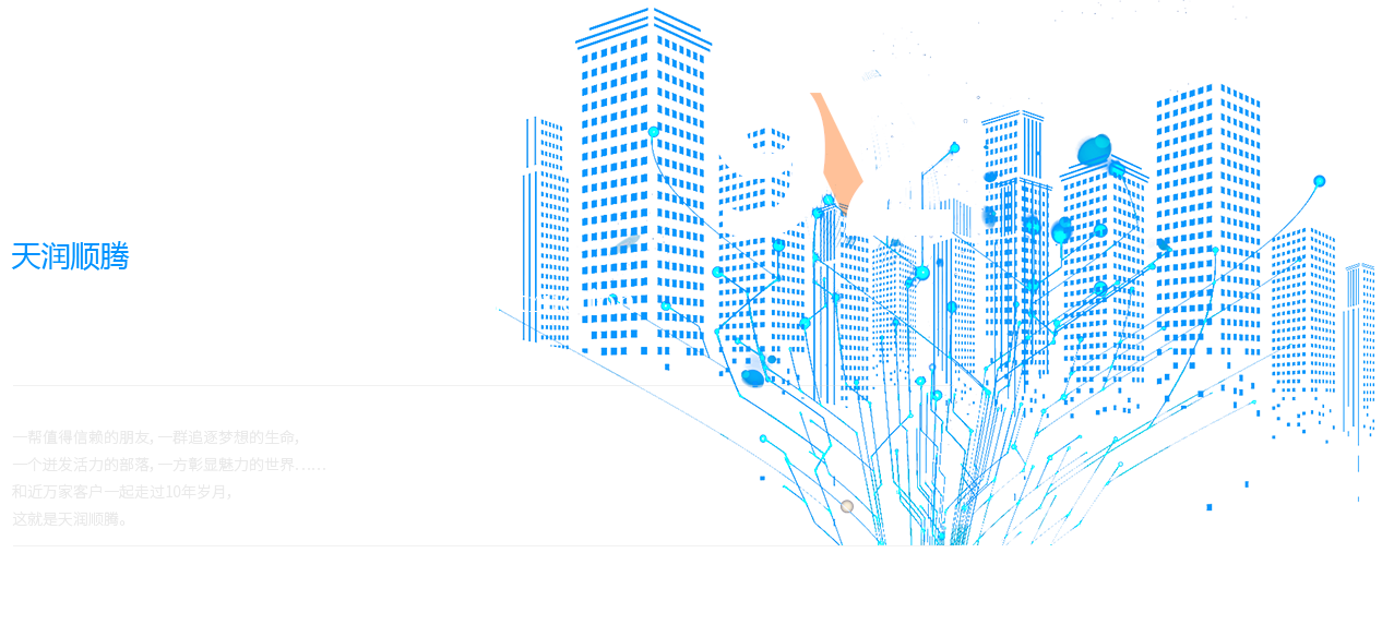 一幫值得信賴的朋友,一群追逐夢想的生命, 一個(gè)迸發(fā)活力的部落,一方彰顯魅力的世界…… 和近萬家客戶一起走過10年歲月, 這就是天潤順騰。
